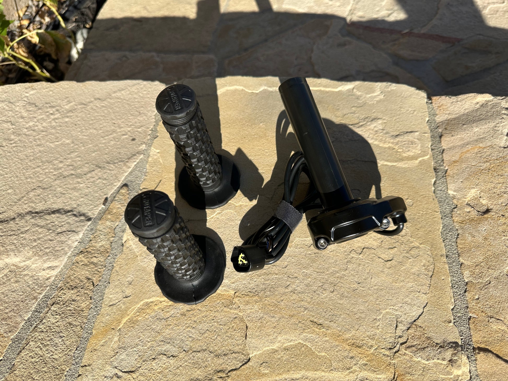 Includes Fardriver 72450 controller, Surron Throttle w/ black pillow top grips, Key switch w/ voltmeter, and 3-speed mode switch.